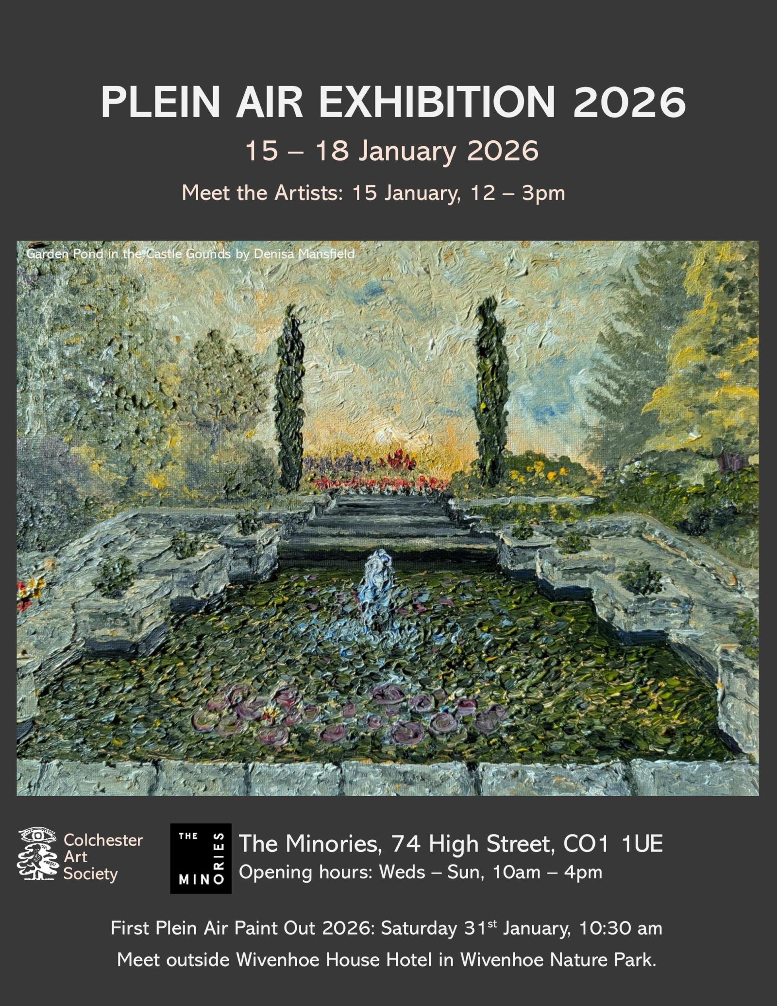 The first Plein Air Exhibition, organised by Denisa Mansfield and sponsored by the Colchester Art Society, celebrates artists who embrace the challenge of working outdoors. This diverse collection showcases a range of subjects and personal approaches, united by a shared focus on light, atmosphere, and immediacy. We invite you to explore the exhibition and enjoy the works on display.