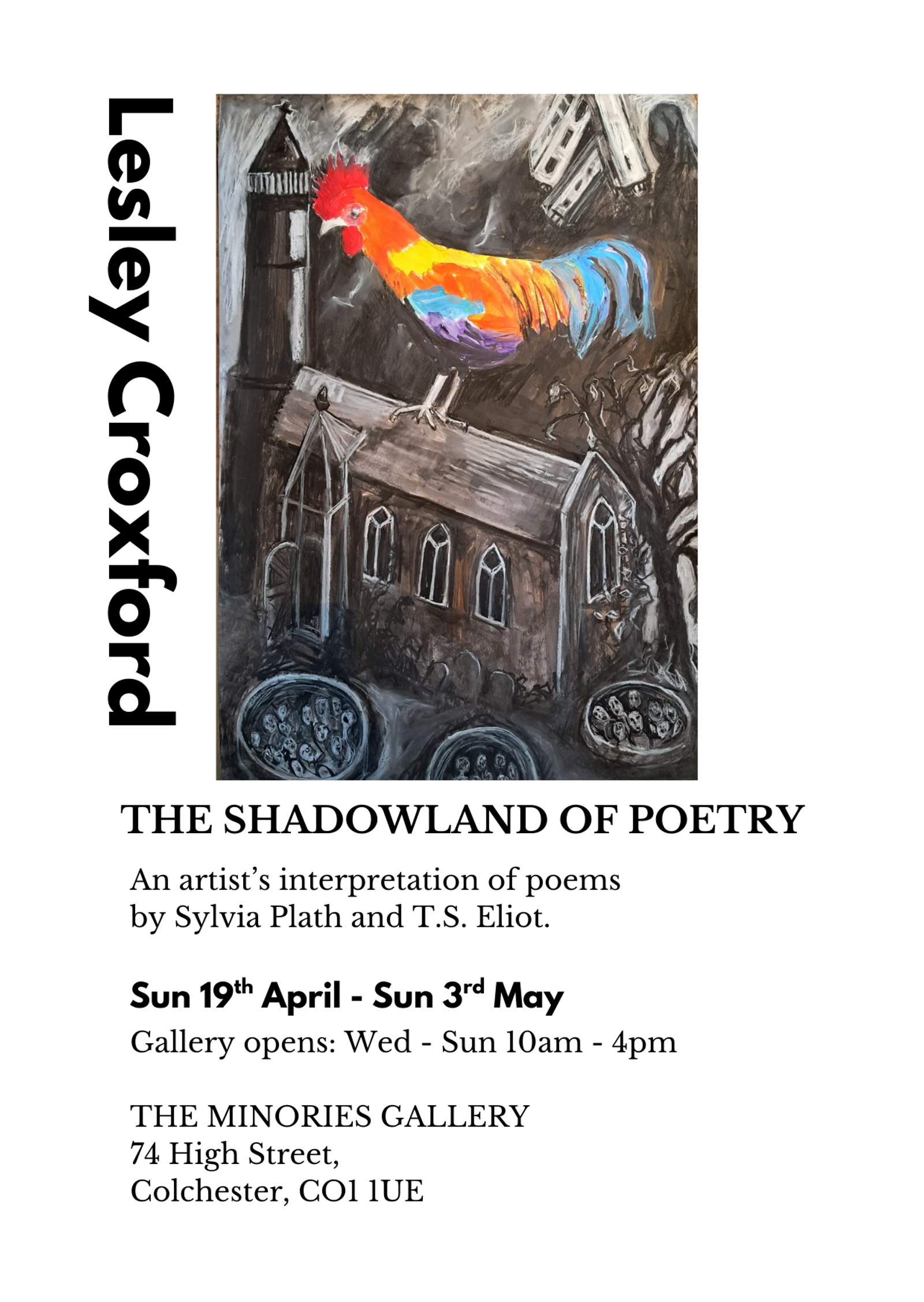 Lesley endeavours to make visible through her drawings and paintings the images she sees in her mind from the poet’s words and to recreate the poet’s world of imagination on paper, canvas or installations, absorbing within them the shadowland of their darker world of feelings, emotions and psychological states.